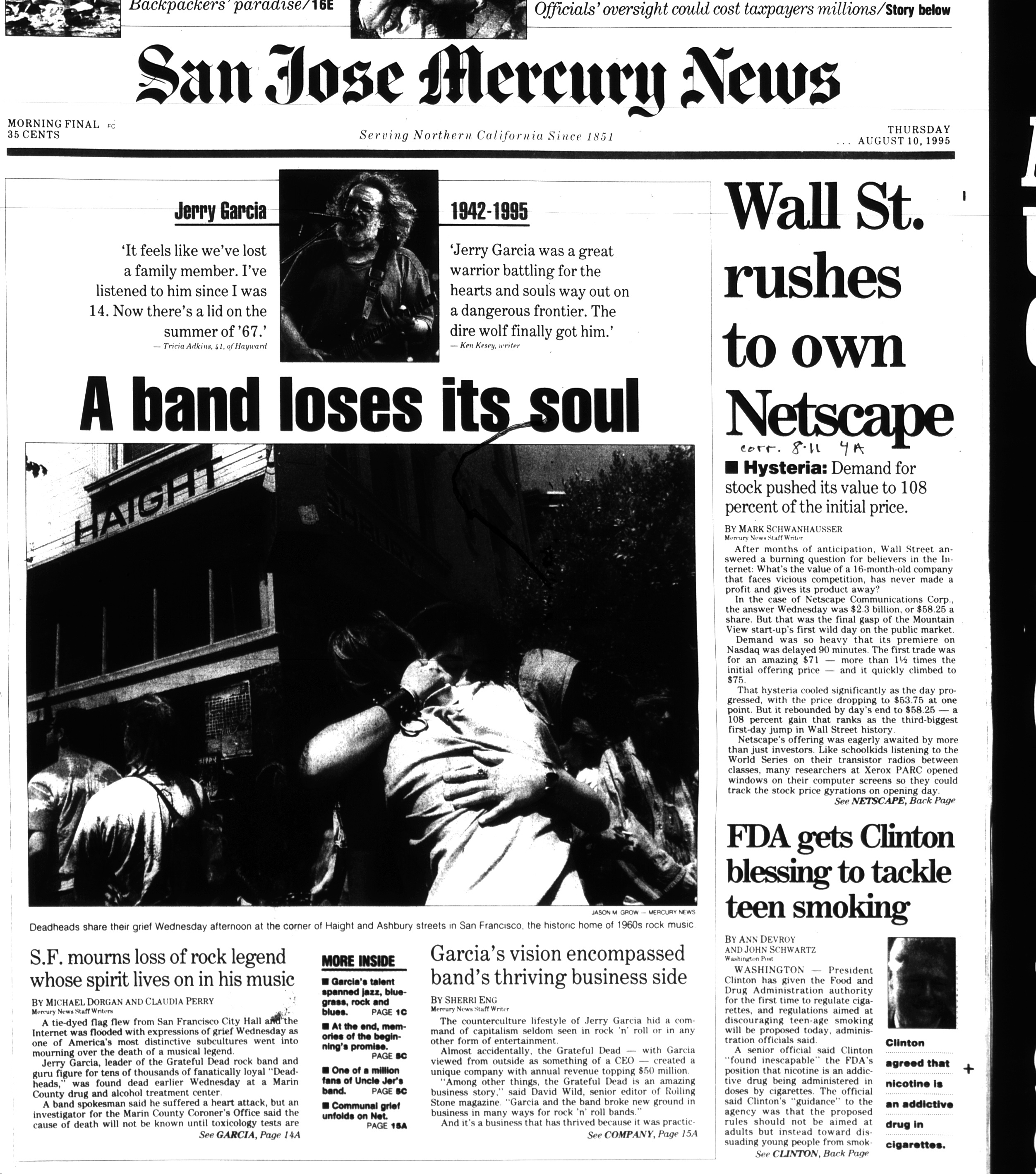 Reports about the IPO made the front page the following day in many newspapers, including the Mercury News (see left). But the Mercury News gave top billing not to Netscape but to news the death of Jerry Garcia, the Grateful Dead’s co-founder and front man.