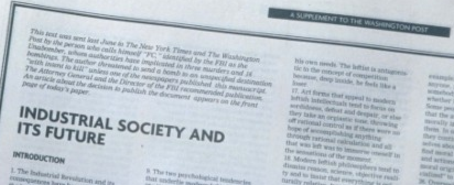 The “Manifesto” was a 35,000 word screed written by a reclusive and anonymous serial killer who, from time to time over a 17-year period, mailed or placed bombs that killed three people and injured 23 others. Universities and airlines were his early targets, and he came to be called “Unabomber.”