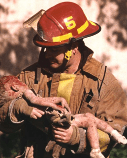 And there’s the award-winning photograph that helped define the bombing, Charles Porter’s image of the Oklahoma City firefighter cradling a fatally injured child, one-year-old Baylee Almon.